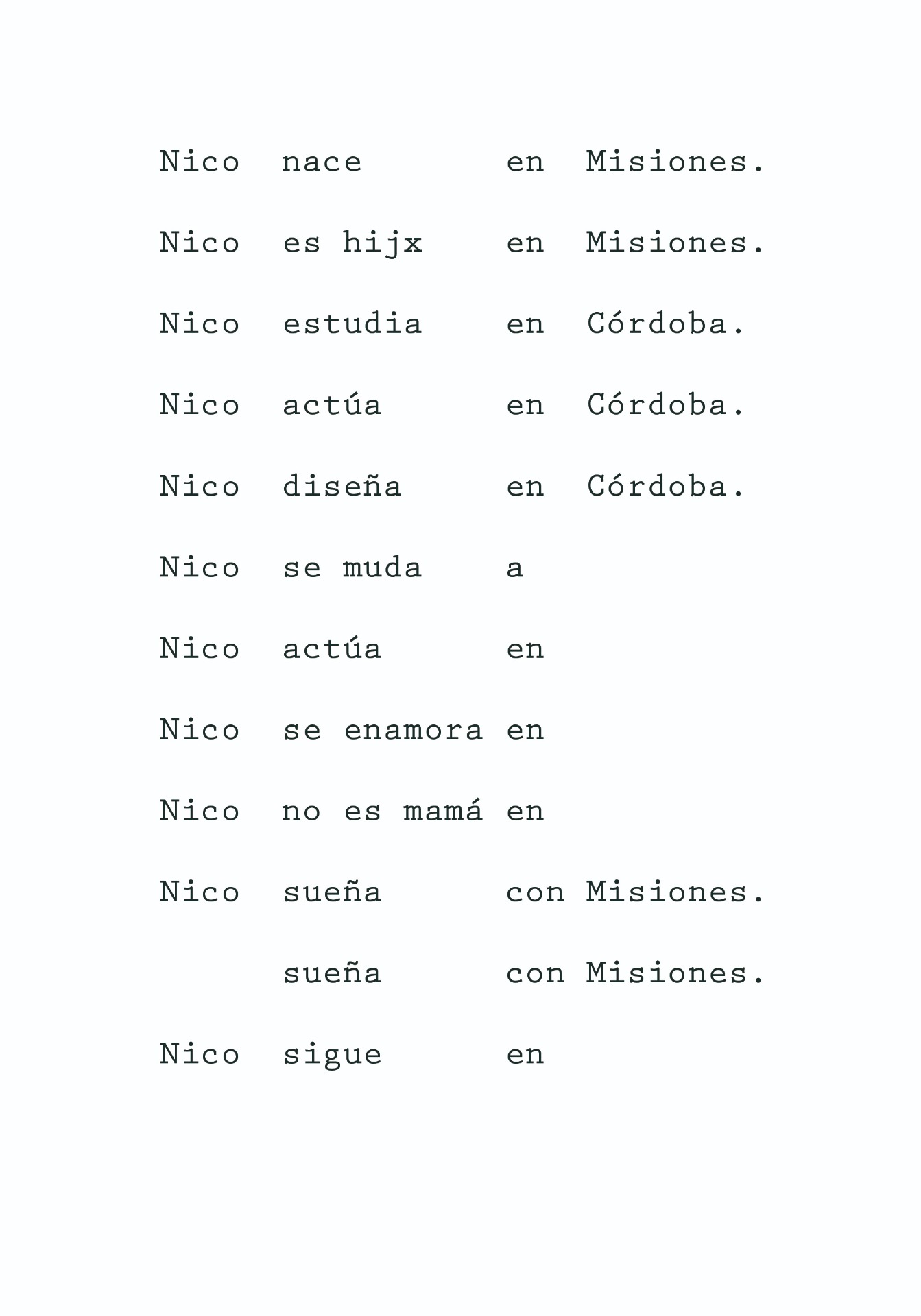 Posadas, Misiones. (1989) Vive en Buenos Aires. Artista interdisciplinar y arquitecto. Comenzó su carrera estudiando arquitectura y teatro. Luego de ser Becado por la Università degli Studi di Salerno para estudiar la historia del arte y la arquitectura de Italia (2011), se interesa por las relaciones entre el cuerpo y el espacio en las Artes Performáticas en los bordes entre lo real y lo ficticio, investigando en la hibridación entre el teatro, las artes visuales y la arquitectura. Ha desarrollado trabajos en diversas piezas performáticas y teatrales como director y actor: "¿Dónde quedaron los rieles por donde viaja la memoria?" (2015) es una instalación site-specific acerca del patrimonio y la memoria en una vieja estación de trenes que conectaba Buenos Aires con Misiones, Argentina. RING (2016) es una investigación escénica acerca de poesía latinoamericana y boxeo, que fue nombrada de Interés cultural por Mecenazgo cultural de la Ciudad de Buenos Aires. "(28) aproximaciones a la muerte" (2016) es una performance duracional, pensada para ser hecha una vez al año durante toda su vida. Ha desarrollado proyectos y participado de festivales en Argentina, México, Alemania y Estados Unidos trabajando junto a otros artistas en colaboración. Se desempeña como asistente artístico del artista internacional Fernando Rubio, y es parte del equipo creativo de la primera escuela de performance y creación multidisciplinar "El Jardín Sahel". Actualmente se encuentra finalizando la tesis de la Maestría en Artes performáticas en la Universidad Nacional de las Artes. En el 2017 dirigió con Lucía Lipsich la obra "Autobiografía" (seleccionada para participar del ciclo Miradas Interiores en Oeste Usina Cultural, 2017) la que aborda la vida de un intérprete y el museo de su propia vida, con el actor también misionero Cristian Salguero. Además, es creador junto a un grupo de artistas del festival "Agotar la performance" espacio de encuentro entre artistas emergentes que funciona como plataforma de presentación, relación y reflexión acerca de las prácticas performáticas.